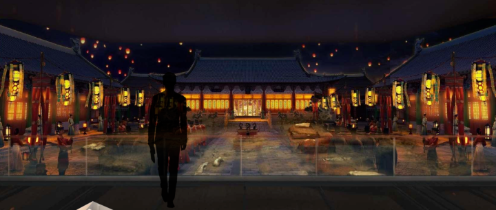 以正殿遺址所在之處為例,觀眾能在中區(qū)遺址的設(shè)計(jì)動線上看到三塊巨型幕布,將遺址北、東、西三面包圍住,通過視覺融合技術(shù)四面成像,打造成一個(gè)沉浸式CAVE空間,復(fù)原宮廷生活景象,以裸眼效果帶給觀眾身臨其境的感覺,觀眾可通過沉浸式互動解讀展示遺址信息,了解德壽宮遺址變遷及建筑營造制度,俯瞰臨安繁華,體驗(yàn)?zāi)纤位始叶Y儀。